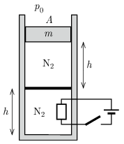 P. 5574. Alul zárt, függőleges, hőszigetelt hengerben lévő dugattyúk azonos hőmérsékletű és térfogatú nitrogént zárnak el. Kezdetben a hőmérséklet \(\displaystyle T_1=300~\mathrm{K}\). A felső dugattyú súrlódásmentesen mozoghat, a tömege \(\displaystyle m=40~\mathrm{kg}\), az alsó jó hővezető anyagból készült és rögzített, a felső hőszigetelt. A külső légnyomás \(\displaystyle 10^5~\mathrm{Pa}\), az alsó gáz nyomása \(\displaystyle 1{,}2\cdot 10^5~\mathrm{Pa}\), a henger alapterülete \(\displaystyle A=1~\mathrm{dm^2}\), \(\displaystyle h=0{,}5~\mathrm{m}\).