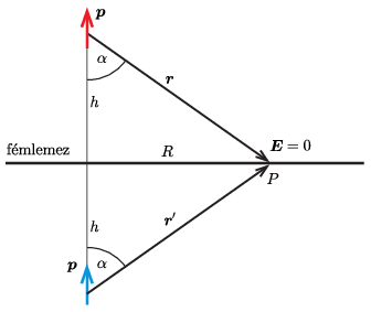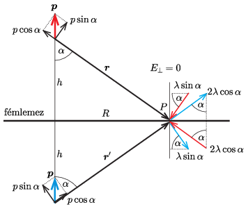 Az egyes dipóluskomponensek nagysága \(\displaystyle p\cos\alpha\) és \(\displaystyle p\sin\alpha\), és a \(\displaystyle P\) pont mindegyik dipól-összetevőtől ugyanakkora \(\displaystyle r\) távolságban van. Ennek megfelelően az eredő elektromos térerősség a fémlemez \(\displaystyle P\) pontjánál – a szuperpozíció-elvnek megfelelően – a négy járulék összege