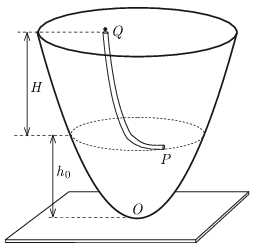 P. 5599. Egy forgási paraboloid alakú, függőleges szimmetriatengelyű, vékony fémserleget az \(\displaystyle O\) csúcsánál vízszintes tartólaphoz erősítettünk. A \(\displaystyle P\) pont és a síklap távolsága \(\displaystyle h_0\). A serleg belsejében elhelyezett vékony csőbe, annak \(\displaystyle Q\) végpontjánál egy pontszerű testet ejtettünk, amely a serleg \(\displaystyle P\) pontjánál hagyja el a csövet. A \(\displaystyle Q\) és a \(\displaystyle P\) pont magasságkülönbsége \(\displaystyle H\).