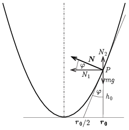 Megjegyzés. Ha \(\displaystyle H=h_0\), akkor a test körpályán, egyenletes körmozgással kering. Ezt a mozgásegyenletből is megkaphatjuk. A serleg által kifejtett \(\displaystyle \boldsymbol{N}\) nyomóerő függőleges komponense