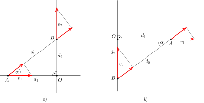 I. megoldás. Vázoljuk azt a helyzetet, amikor a két motoros közötti távolság éppen a minimális \(\displaystyle d_0\). Amikor mindkét motoros közeledik a kereszteződéshez, vagy már távolodik attól, a távolságuk egyértelműen csökken, illetve nő, tehát a kérdéses pillanatban az egyik még nem, de a másik már elhagyta a kereszteződést. Jelöljük a pozíciójukat \(\displaystyle A\)-val és \(\displaystyle B\)-vel, legyen a távolságuk az \(\displaystyle O\)-val jelölt kereszteződéstől rendre \(\displaystyle d_1\) illetve \(\displaystyle d_2\), és legyen \(\displaystyle BAO\sphericalangle=\alpha\), ahogy azt az 1. ábra a) része mutatja.