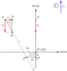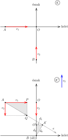 Üljünk most bele a \(\displaystyle \cal{K}\)-hoz képest \(\displaystyle v_2\) sebességgel észak felé mozgó \(\displaystyle \cal{K}'\) koordináta-rendszerbe, és írjuk le onnan nézve a motorosok mozgását. Ebben a rendszerben a második motoros áll, az első pedig \(\displaystyle v_1\) sebességgel halad kelet felé, miközben \(\displaystyle v_2\) nagyságú, dél felé irányuló sebességgel is rendelkezik (lásd a 2. ábra alsó felét). Az első motoros tehát \(\displaystyle \sqrt{v_1^2+v_2^2}\) nagyságú sebességgel nagyjából délkelet felé halad az \(\displaystyle e\) jelű egyenes mentén. Az utak kereszteződési pontja ugyancsak mozogni fog \(\displaystyle \cal{K}'\)-ben, nevezetesen \(\displaystyle v_2\) sebességgel halad dél felé.