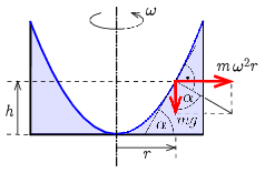 ahol \(\displaystyle r\) a forgástengelytől mért távolság, \(\displaystyle h\) a forgási paraboloid csúcsától mért magasság, \(\displaystyle \omega\) a forgás szögsebessége és \(\displaystyle g\) a nehézségi gyorsulás.