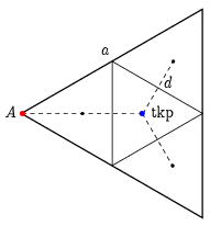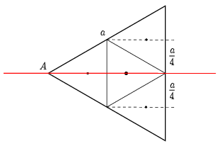 ahol \(\displaystyle d=\tfrac{a}{2\sqrt{3}}\) a három nem középen lévő kis háromszög tömegközéppontjának távolsága a közös tömegközépponttól. Ezt behelyettesítve és rendezve: