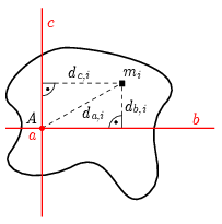 Megjegyzések. 1. Vegyük észre, hogy \(\displaystyle \Theta_\mathrm{a}=\Theta_\mathrm{b}+\Theta_\mathrm{c}\) (\(\displaystyle \tfrac{5}{12}=\tfrac{1}{24}+\tfrac{3}{8}\)). Ez nem véletlen! Egy síkidom tehetetlenségi nyomatéka bármely tengelyre a \(\displaystyle \Theta=\sum m_id_i^2\) összefüggéssel számítható ki, ahol \(\displaystyle d_i\) az adott kis tömegelem távolsága a kiválasztott tengelytől. A 4. ábrán látható, hogy a síklapra merőleges \(\displaystyle a\) tengelytől mért \(\displaystyle d_{a,\,i}\) távolságra fennáll, hogy \(\displaystyle d_{a,\,i}^2=d_{b,\,i}^2+d_{c,\,i}^2\), ahol \(\displaystyle d_{b,\,i}\) és \(\displaystyle d_{c,\,i}\) a síkban lévő, egymásra merőleges \(\displaystyle b\) és \(\displaystyle c\) tengelyektől mért távolságok.