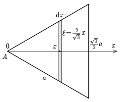 II. megoldás. A tehetetlenségi nyomatékok kiszámíthatók integrálszámítással is. Itt most a háromszöglapot \(\displaystyle \mathrm{d}x\) szélességű, \(\displaystyle \ell=\tfrac{2}{\sqrt{3}}x\) hosszúságú kis téglalapokból fogjuk összerakni (5. ábra), amelyek tehetetlenségi nyomatéka a középpontjukon átmenő, a szakaszra merőleges tengelyekre \(\displaystyle \mathrm{d}\Theta=\tfrac{1}{12}\ell^2\mathrm{d}m\), a szakaszon átmenő tengelyre pedig nulla. A kis szakasz tömegét a \(\displaystyle \mathrm{d}m=\tfrac{m}{A}\ell\mathrm{d}x\) összefüggéssel fejezhetjük ki, ahol \(\displaystyle A=\tfrac{\sqrt{3}}{4}a^2\) a háromszög területe. Ahol szükséges, használjuk a Steiner-tételt.