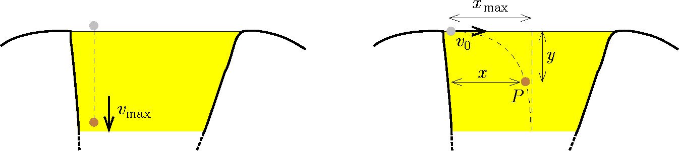 Ezután a kis herceg a partról úgy dob egy kavicsot a tóba, hogy az a part közvetlen közelében \(\displaystyle v_0\) nagyságú, közel vízszintes irányú sebességgel érkezik a mézbe. Kiszámítja, hogy a kavics a parttól (vízszintesen mérve) legfeljebb \(\displaystyle x_{\mathrm{max}}\) távolságban érhet a tó fenekére.