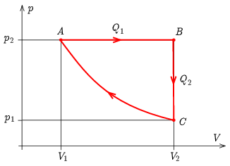 Megoldás. Az ábra egy a leírásnak megfelelő körfolyamat \(\displaystyle p\)-\(\displaystyle V\) diagramját mutatja. Az A, B és C pontokban a gáz állapotváltozói rendre \(\displaystyle p_2\), \(\displaystyle V_1\) és \(\displaystyle T_\mathrm{A}=p_2V_1/nR\); \(\displaystyle p_2\), \(\displaystyle V_2\) és \(\displaystyle T_\mathrm{B}=p_2V_2/nR\); illetve \(\displaystyle p_1\), \(\displaystyle V_2\) és \(\displaystyle T_\mathrm{C}=p_1V_2/nR\), ahol \(\displaystyle n\) a gáz mennyisége mólokban kifejezve.