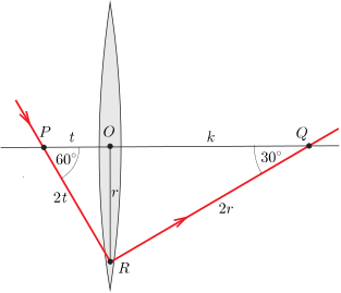 Ha az irányváltozás helye az optikai tengelyről \(\displaystyle r\) távolságban van, akkor az \(\displaystyle ORP\) és \(\displaystyle OQR\) félszabályos háromszögekre alkalmazott Pitagorasz-tételből kapjuk, hogy