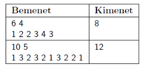 Korlátok: \(\displaystyle 1 \le Z \le N \le 30\), \(\displaystyle 1 \le m_i \le Z\).