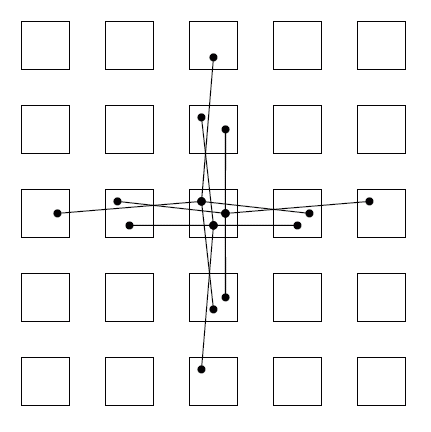 Készítsünk egy G gráfot a következő módon: minden mezőhöz vegyünk fel három csúcsot, melyek jelentése: "az adott mezőn álló helyzetben", "az adott mezőn jobbra fekvő helyzetben", "az adott mezőn lefelé fekvő helyzetben". Majd minden csúcsot kössük össze azokkal a csúcsokkal, amelyekbe az adott csúcsban lévő téglatest egyetlen görgetéssel eljuttatható. Tehát pl. a ((x,y), álló helyzet) csúcsot az ((x+1,y), jobbra fekszik), ((x-2,y), jobbra fekszik), ((x,y+1), lefelé fekszik), ((x,y-2), lefelé fekszik) csúcsokkal. Az ábra a középső mezőn lévő álló (felül), jobbra (jobbra), lefelé (alul) helyzethez tartozó csúcsok szomszédait mutatja: