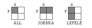Először is azt kell meggondolni, hogy miként írjuk le a téglatest pozícióját. Erre egy kézenfekvő megoldás, ha mindig azt nézzük, hogy az adott helyzetben melyik mezőn van a bal felső fele, és erről a mezőről (ha fekszik) merre lóg le. Tehát a téglatestnek van egy koordinátája (azé a mezőé, amin a bal felső fele van), és egy helyzete: áll, jobbra fekszik, lefelé fekszik. Vegyük észre, hogy ha például egy jobbra fekvő téglatestet jobbra gördítünk, x-koordinátája 2-vel növekszik.