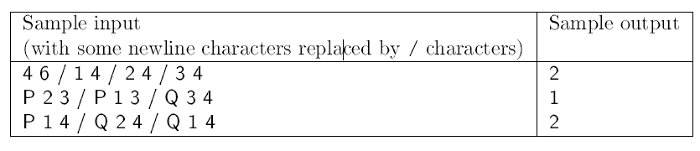 Your program should read the values of \(\displaystyle N\) and \(\displaystyle M\) from the first line of the standard input, then the tree edges (represented by the integers \(\displaystyle u\) and \(\displaystyle v\)) from the following \(\displaystyle N-1\) lines. Then each of the following \(\displaystyle M\) lines starts with either a letter P or Q, followed by a pair of integers \(\displaystyle u, v\). This last pair denotes a pair of vertices. Letter ``P'' means that Andrew has put one chocolate on every edge of the unique path between the vertices \(\displaystyle (u, v)\). Letter ``Q'' means that Brian has asked for the number of chocolates on the edge \(\displaystyle (u, v)\). Your program should write the answer to Brian's questions in the successive lines of the standard output.