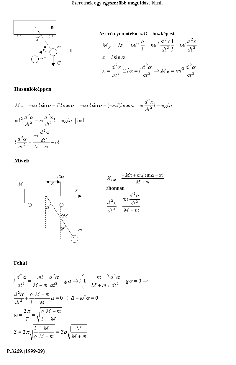 P. 3269. Könnyen mozgó, M tömegű kiskocsira fonálingát függesztettünk. Az ingatest tömege m, a fonál hossza l. A kocsit rögzítve az ingát kicsit kitérítjük, majd magára hagyjuk. A lengésidő megmérése után megismételjük a kísérletet úgy is, hogy a kiskocsit nem rögzítjük. Hogyan változik az inga lengésideje? (4 pont)