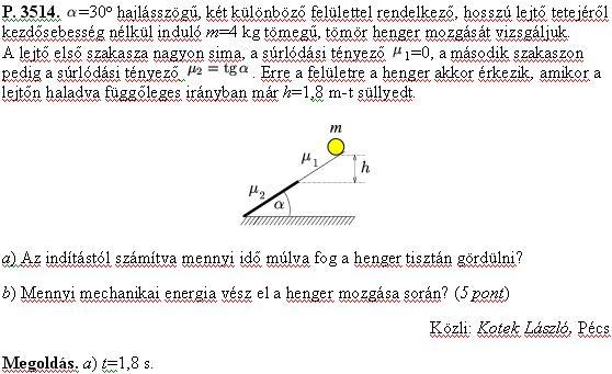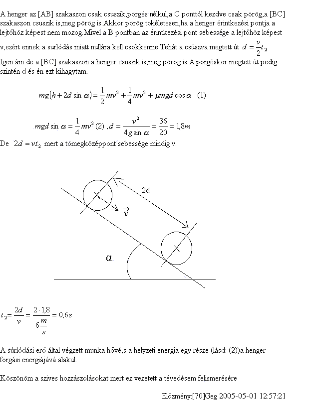 Nekem tetszik ez a megoldas.Szamomra kenyes kerdes az energia atalakulas.A surlodasi ero szukseges a henger felporgetesehez,es a helyzeti energia atalakul a henger forgasi energiajava,de a surlodasi ero munkavegzese soran a helyzeti energia tovabbi resze hove alakul at.Elnezest kerek,de nem volt lehetosegem magyar betukkel irnom.