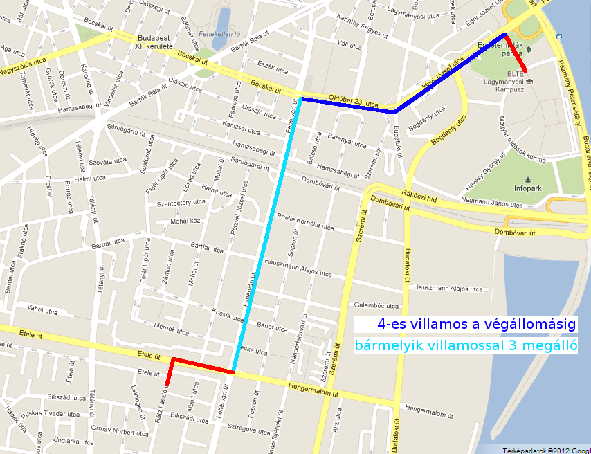 Megközelítés az egyetem felől: 4-es villamossal Újbuda Központ végállomásig (2 megálló), onnan bármelyik villamossal a "Hengermalom út" megállóig (ez a 3. megálló), majd gyalog.
