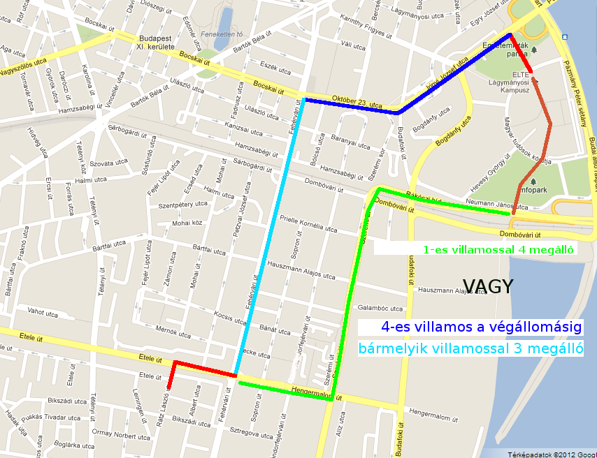 Megközelítés az egyetem felől: egy kis séta után az 1-es villamos Infopark megállójáig, onnan 4 megálló az "Etele út / Fehérvári út" megállóig VAGY a 4-es villamossal Újbuda Központ végállomásig (2 megálló), onnan bármelyik villamossal az "Etele út / Fehérvári út" megállóig (ez a 3. megálló), majd gyalog.