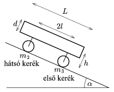 A henger és az út közötti tapadási (statikus), illetve csúszási (kinetikus) súrlódási együtthatókat jelöljük rendre \(\displaystyle \mu\)s-sel és \(\displaystyle \mu\)k-val. A téglatest alakú járműtest tömege m1 = 5 M, hossza L, vastagsága pedig d. Az első és a hátsó kerekek tengelyei közötti távolság 2 l, míg a kerekek középpontjának a járműtest középsíkjától mért távolsága h. Tételezd fel, hogy a kerekek súrlódásmentesen csapágyazottak.