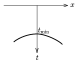 1. ábra. A t visszaérkezési idő az x detektorhelyzet függvényében, tmin = 100 ns