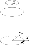 I. 35. We put an ant close beside the base of a cylinder-jacket with radius R and height H. In every minute the ant creeps upwards M centimetres. The cylinder is rotated around its axis (which is just the Z-axis) anticlockwise completing T turns per minute. The ant starts from the point (R,0,0), and we are watching it at an angle of ALPHA degree relative to the Y-axis, see Figure 1.