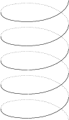 Write your program (I35.pas, ...) which reads the values of R (1\(\displaystyle \le\)R\(\displaystyle \le\)50), H (1\(\displaystyle \le\)H\(\displaystyle \le\)200), M (1\(\displaystyle \le\)M\(\displaystyle \le\)H), T (1\(\displaystyle \le\)T\(\displaystyle \le\)100) and ALPHA (0\(\displaystyle \le\)ALPHA<90), then displays the axonometric projection to the plane Y=0 of the path of the ant using continuous line on the visible side of the cylinder and dotted line on the back side.
