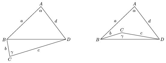 \(\displaystyle A_{ABCD}=A_{ABD}\pm A_{BCD}\le A_{ABD}+A_{BCD}=\frac{a\cdot d\cdot\sin\alpha}{2}+\frac{b\cdot c\cdot\sin\gamma}{2}\le\frac{ad+bc}{2}. \)
