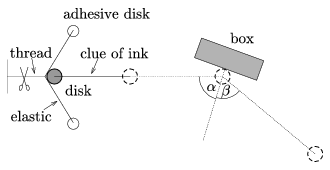 Solution. For an adequate measurement one needs a `puck launching device' which can repeat puck launches at the same initial speed (within measurement error). This technical problem was resolved by most competitors, using a spring or rubber operated `catapult'. Biró István (10th form student of Bolyai Farkas Secondary School, Marosvásárhely) constructed a clever device, which, in addition to the repeatable launches, solved the problem of recording the path of the puck (Fig. 1). He bore a hole into the middle of the puck, into which he put a toothpick wrapped in sewing thread. He had black ink permeated into the thread, and so the end of the sewing thread, just touching a glass plate, draw the path of the centre of mass of the puck.