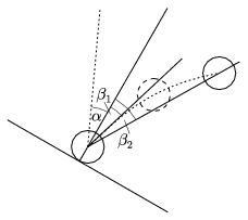 Two competitors, Nagy Ádám (12th form student of Szent István Secondary Grammar School, Budapest) and Biró István, noticed that the reflected path of the puck `bends', but they did not use this fact in the determination of the reflection angle. All of the competitors calculated the \(\displaystyle \beta\)2 reflection angle from the position of the puck after it had stopped, but this differs slightly from angle \(\displaystyle \beta\)1 which characterizes the collision better though it is more difficult to measure (Fig. 2).