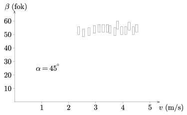 The experimental examination of velocity dependence is more difficult than measuring the angles. Using slopes the attainable velocity differences of the pucks started from different heights are not big enough - with considerable measurement errors - to find a definite connection between the angles and velocities. (Using catapult devices the velocity of the impact can be greater, but the measurement of velocity becomes more inaccurate.) The data measured by Jurányi Zsófia is shown in Figure 5. She plotted the \(\displaystyle \beta\) reflection angle (the accuracy of the measurement is also indicated) against different v impact velocities at fixed \(\displaystyle \alpha\)=45o incidence angle. It can be seen that in the investigated interval \(\displaystyle \beta\) is independent of v.