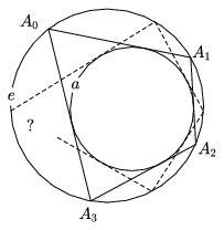 Poncelet's Theorem: Let the circle a lie in the interior of a circle e, not touching it. Starting at an arbitrary point A0 on e, the points A1,A2,... of circle e can be successively constructed, such that the chords A0A1,A1A2,... are all tangent to the circle a, and any two consecutive lines should be different.