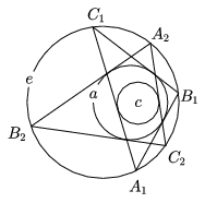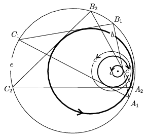 Figure 5 shows an attempt to construct a triangle when the data are inconsistent. The circles e and a correspond to such a situation. From an arbitrary point A of the circle e, a tangent is drawn to a. The tangent intersects e at the next vertex B of the triangle. C is obtained by drawing the other tangent to a from B. As the line AC does not touch a, it is clear that the construction was not successful. After a number of similar attempts, Poncelet must have noticed (as that is what he has proved) that although none of the lines AC obtained by the construction touch the circle a, they all do touch a certain other circle c. What is more, this circle c belongs to the pencil generated by e and a. This is particularly apparent in the case of intersecting circles a, e, when the construction of the triangle is obviously hopeless.