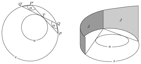 It follows now that the areas over the arcs PP' and QQ' are also equal. Let the points P and P' move along the circle e so that the chord PP' should remain tangent to the circle a. It follows from the above considerations that the area over the arc PP' will also remain constant. Let the value of that constant area be J, and let the area of the whole surface be I.