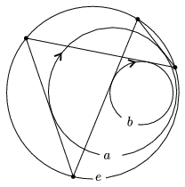 Consider now the mapping defined on the set of points of the circle e that maps the point X\(\displaystyle \in\)e onto the point where the tangent drawn from X in the appropriate direction to the (directed) circle a intersects the circle e again. If the circle a coincides with e, then this mapping is defined to be the identity that maps the points of e onto themselves. If they are concentric but not identical, the mapping is a simple rotation. In any other case, it is not a rotation, only similar to it. That kind of mapping is called an ``oblique rotation''. The composition of two consecutive rotations about the same point is equivalent to a single rotation through an angle equal to the sum of the two angles of rotation.