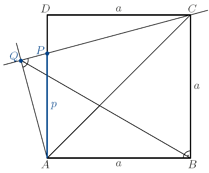 1. Megoldás. Legyen a négyzet oldalának hossza \(\displaystyle a\), és alkalmazzuk az \(\displaystyle {AP=p}\) jelölést. A feltételek miatt \(\displaystyle {APQ\sphericalangle=75^{\circ}}\); \(\displaystyle {QAP\sphericalangle=15^{\circ}}\); \(\displaystyle {PAC\sphericalangle=CAB\sphericalangle=45^{\circ}}\); \(\displaystyle {ACP\sphericalangle=30^{\circ}}\).