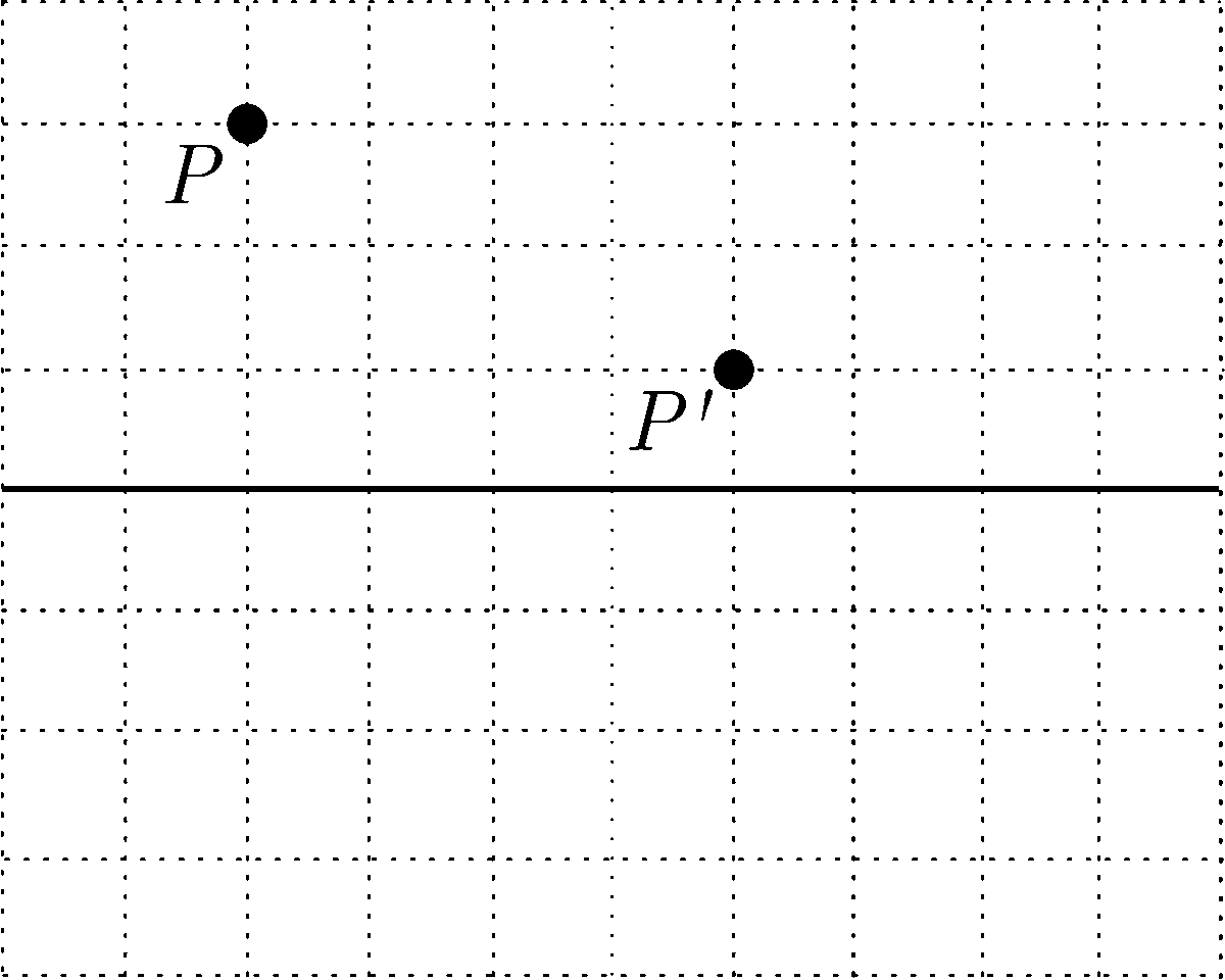 G. 911. Egy vékony szórólencse az ábrán látható \(\displaystyle P\) pontról a \(\displaystyle P'\) pontban állít elő látszólagos képet. A lencse optikai tengelyét a folytonos vonal jelöli, a négyzethálón egy-egy beosztás vízszintesen \(\displaystyle 10~\mathrm{cm}\)-nek, függőlegesen \(\displaystyle 1~\mathrm{cm}\)-nek felel meg. Mekkora a lencse fókusztávolsága?