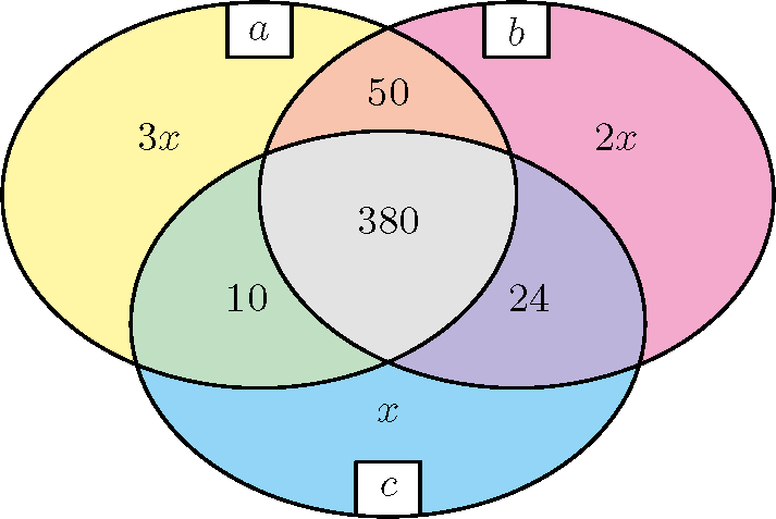 A visszaváltott termékek anyagának típusát három csoportba sorolták: \(\displaystyle a\) (műanyag), \(\displaystyle b\) (fém), \(\displaystyle c\) (üveg). A fenti \(\displaystyle 500\) vásárló közül arra a kérdésre, hogy milyen típusú palackokat szoktak visszaváltani, \(\displaystyle 380\)-an az \(\displaystyle a\), \(\displaystyle b\), \(\displaystyle c\); \(\displaystyle 50\)-en az \(\displaystyle a\), \(\displaystyle b\); \(\displaystyle 24\)-en a \(\displaystyle b\), \(\displaystyle c\); \(\displaystyle 10\)-en az \(\displaystyle a\), \(\displaystyle c\) választ adták. Azok száma, akik csak egyfajta terméket váltottak vissza, \(\displaystyle 3:2:1\) arányban oszlott meg az \(\displaystyle a:b:c\) típusok között.