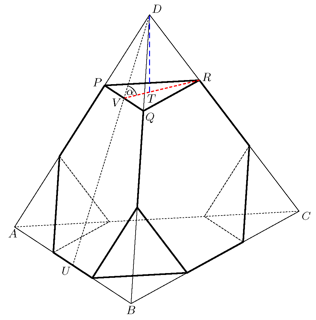 A keresett szög a szabályos tetraéder lapjai által bezárt szög mellékszöge. Az ábrán látható \(\displaystyle VTD\) derékszögű háromszög \(\displaystyle VT\) befogója a \(\displaystyle VD\) átfogó harmada, mivel \(\displaystyle {PQD}\triangle\cong{PQR}\triangle\) és a \(\displaystyle VR\) szakasz a \(\displaystyle PQR\) szabályos háromszög súlyvonala, amelynek \(\displaystyle T\) harmadolópontja (a szabályos háromszög súlypontja) a \(\displaystyle VTD\) derékszögű háromszög derékszögű csúcsa, tehát: \(\displaystyle \cos \alpha=\dfrac{1}{3}\), ebből \(\displaystyle \alpha=70{,}53^{\circ}\), így a lapok \(\displaystyle 109{,}47^{\circ}\)-os szöget zárnak be egymással.