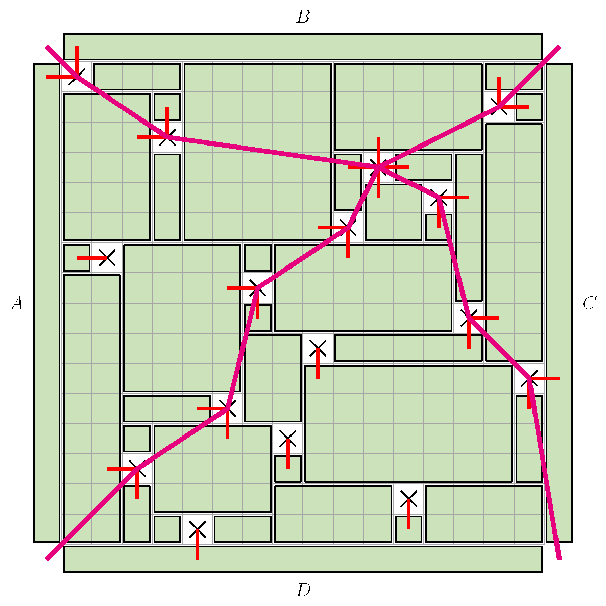 A két töröttvonal négy részre bontja a négyzetrácsot: \(\displaystyle A\)-ra, \(\displaystyle B\)-re, \(\displaystyle C\)-re és \(\displaystyle D\)-re, ahol \(\displaystyle A\) a két töröttvonaltól balra, \(\displaystyle B\) felettük, \(\displaystyle C\) tőlük jobbra és \(\displaystyle D\) alattuk található. Kössük össze az összes \(\displaystyle A\)-ban (vagy határán) lévő \(\displaystyle {\boldsymbol{\times}}\)-et a közvetlenül tőle balra elhelyezkedő csempével, hasonlóan a \(\displaystyle B\)-beliket a fölöttük levővel, a \(\displaystyle C\)-beliket a tőlük jobbra levővel és a \(\displaystyle D\)-beli \(\displaystyle {\boldsymbol{\times}}\)-eket az alattuk levő csempével.