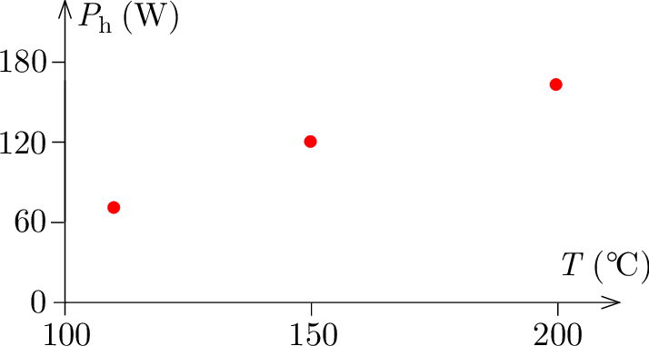 Az elektromos energiafogyasztást a \(\displaystyle W_{\mathrm{e}}=Pt_{\mathrm{f}}\) összefüggésből számoltam, ahol a vasaló névleges teljesítménye \(\displaystyle P=1800~\mathrm{W}\). Feltehetjük, hogy az állandósult állapotban \(\displaystyle t_\textrm{ö}\) idő alatt leadott \(\displaystyle Q\) hőmennyiség megegyezik a felvett elektromos teljesítménnyel: \(\displaystyle Q=W_{\mathrm{e}}\). Az 1 s alatt leadott hőmennyiség a \(\displaystyle P_{\mathrm{h}}=Q/t_{\textrm{ö}}=W_{\mathrm{e}}/t_{\textrm{ö}}\) képlettel számítható ki. Az (előre sejthető összefüggés) jól leolvasható a 2. ábrán: a vasaló által másodpercenként leadott hőmennyiség nő a beállított névleges hőmérséklettel.