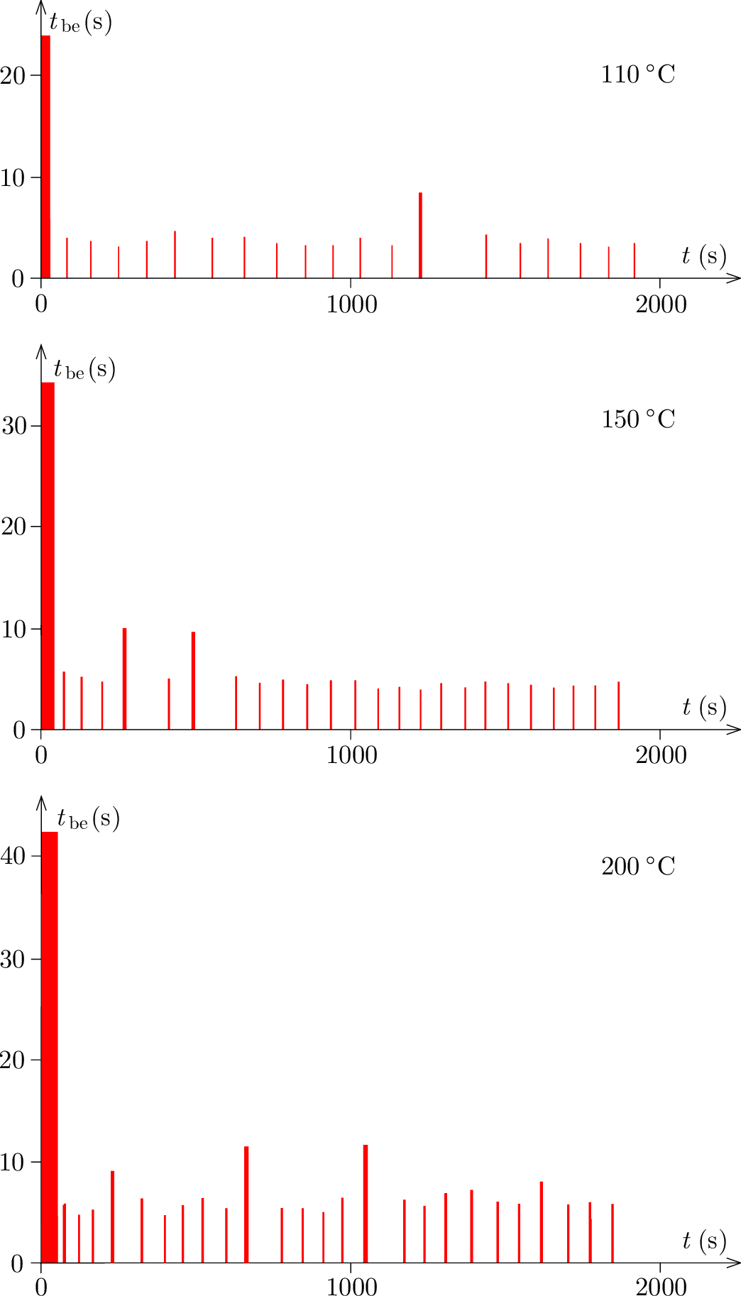 Az 1. ábra különböző beállított hőmérsékletek esetén mutatja a vasaló ki- és bekapcsolási időpontjait. A felfutó élek (a téglalapok bal oldala) a bekapcsolási, a lemenő élek (a téglalapok jobb oldala) pedig a kikapcsolási időpontokat jelzik. Az egymást követő felfutó és lemenő élek közötti időszakaszok az egyes fűtési szakaszok időtartamát adják. Mivel ezek a fűtési szakaszok viszonylag rövidek, szemléltetés céljából az időtartamaikat (\(\displaystyle t_{\mathrm{be}}\)) a megfelelő téglalapok magasságai jelzik. Az ábrán látható, hogy már a második bekapcsolástól kezdve állandósult állapotnak tekinthető a vasaló viselkedése, mert a rövid bekapcsolási időtartamok közel egyformák, és közel periodikusan követik egymást. Ezért az állandósult állapot megfigyelési időszakát úgy jelöltem ki, hogy a második bekapcsolási időponttól az utolsó megfigyelt bekapcsolási időpontig tart. Ezen belül a fűtési idő a bekapcsolt állapothoz tartozó rövid időszakaszok összege. Az állandósult állapot idejét és a fűtési időt a táblázat mutatja a három különböző hőmérséklet-beállítás esetén.