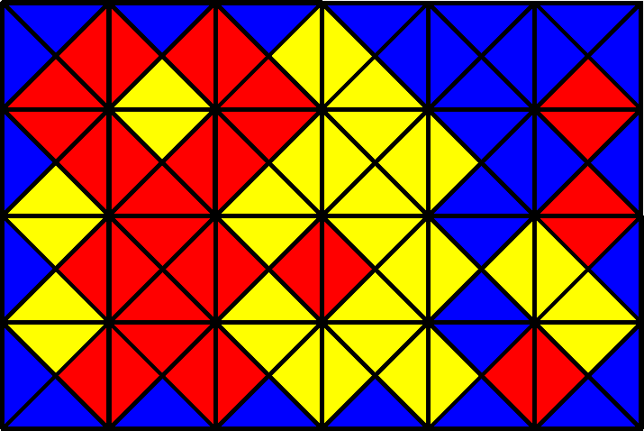 Érdemes elkészíteni az 1. ábrán látható MacMahon-féle készlet elemeit. A fenti \(\displaystyle 4\times6\)-os téglalapon kívül még a szóba jöhető \(\displaystyle 2\times12\)-es és \(\displaystyle 3\times8\)-as is kirakható belőlük, igaz, hogy csak úgy, ha nem kívánjuk meg, hogy a téglalap kerületére csupa azonos szín kerüljön. Próbáljuk meg megoldani ezeket a feladatokat!