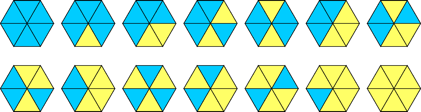 Játszhatóság szempontjából lényegesen más a helyzet a hatszögekkel. Ha három színt használunk a színezéshez, amelyek ismétlődhetnek is, akkor 100-nál több elemet kapunk. Szintén száz feletti az elemek száma hat szín ismétlődés nélküli használata esetén. Két szín használata viszont érdekes készlethez és kérdésekhez vezet. Ebben az esetben 14 különböző elemet kapunk (4. ábra).