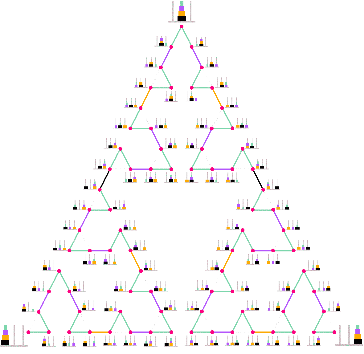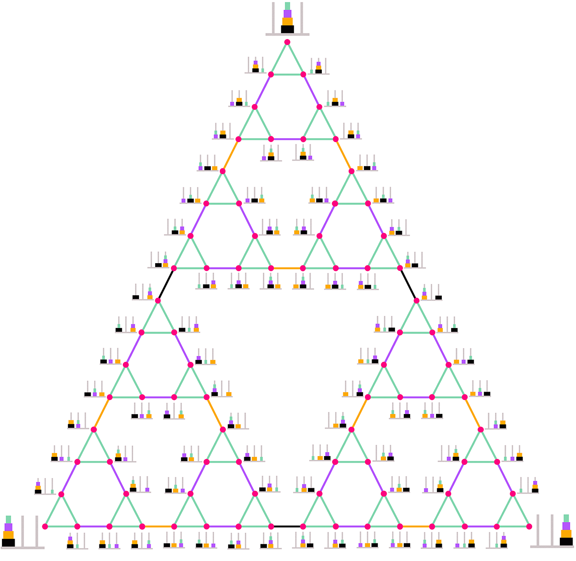 Adjunk hozzá egy második, nagyobb (lila) korongot is! Ekkor attól függően, hogy a lila korong melyik pálcán van, három darab zöld háromszöget kapunk, hiszen a zöld korong mozgását a lila továbbra sem akadályozza. A három zöld háromszög az 1. ábra szerint kapcsolódik egymáshoz lila élekkel. Sokan már sejthetik, mi történik további korong(ok) hozzáadása esetén. A 2. ábra a 4-korongos Hanoi-tornyok gráfját mutatja. Az, hogy a legnagyobb (fekete) korong melyik pálcán helyezkedik el, a gráf egyik ,,harmadát'' határozza meg. Mindegyik harmad megfelel az eggyel kisebb korongszámú Hanoi-tornyok gráfjának, ha figyelmen kívül hagyjuk a fekete korongot: bármelyik harmad \(\displaystyle \pm 120 \) fokos elforgatottja a másik kettő.