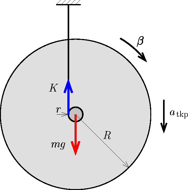 $$\begin{gather*} ma_{\mathrm{tkp}}=mg-K,\\ \Theta\beta=Kr, \end{gather*}$$ahol \(\displaystyle \Theta=\tfrac{1}{2}mR^2\) a tárcsa tehetetlenségi nyomatéka. A kényszerfeltétel miatt (a fonál nem csúszik meg a tengelyen):