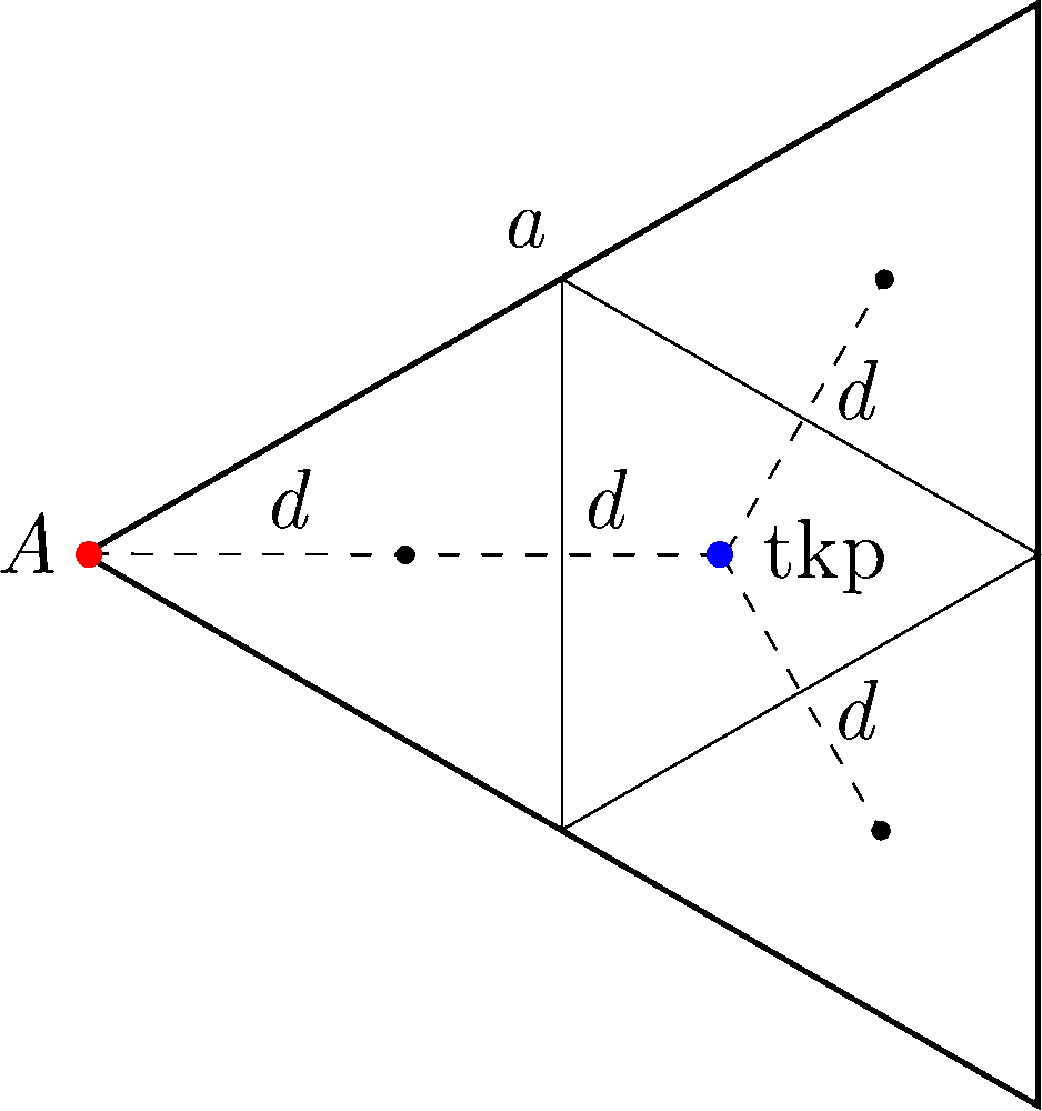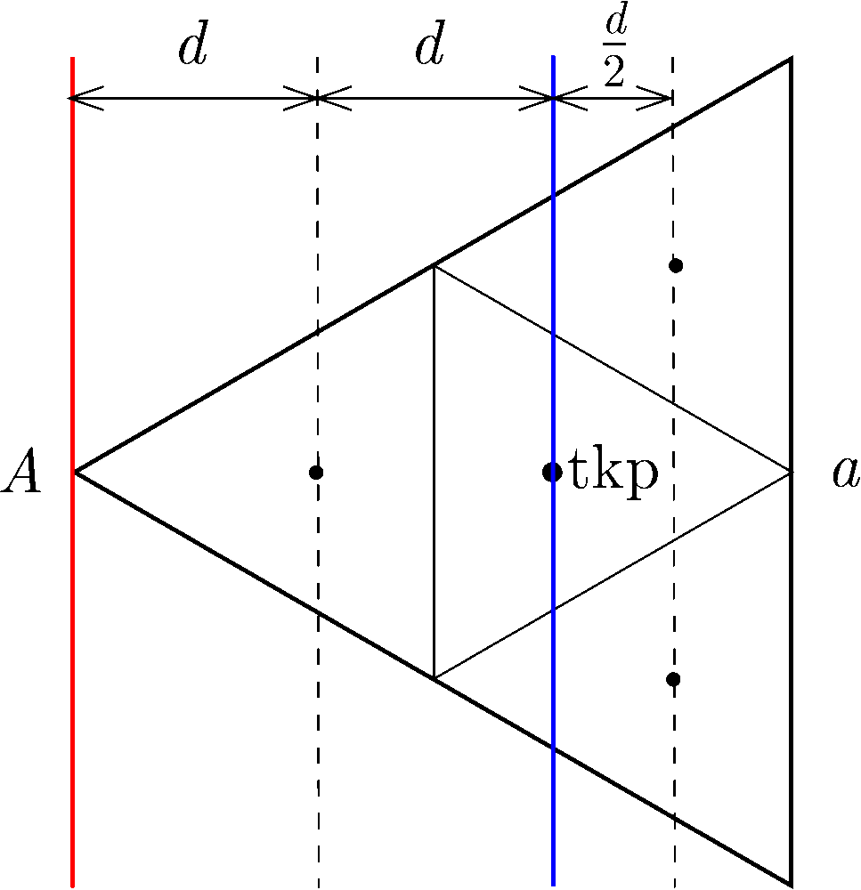 2. A c) kérdésre ennek ismerete nélkül, az előző két esethez hasonló módon is adhatunk megoldást. Ekkor az a) részhez hasonlóan először a tömegközépponton átmenő, az egyik oldallal párhuzamos \(\displaystyle \Theta_{\mathrm{c,tkp}}\) tehetetlenségi nyomatékot határozzuk meg ugyanolyan módszerrel. A 4. ábrán most is \(\displaystyle d=\tfrac{\sqrt{3}}{6}a\).