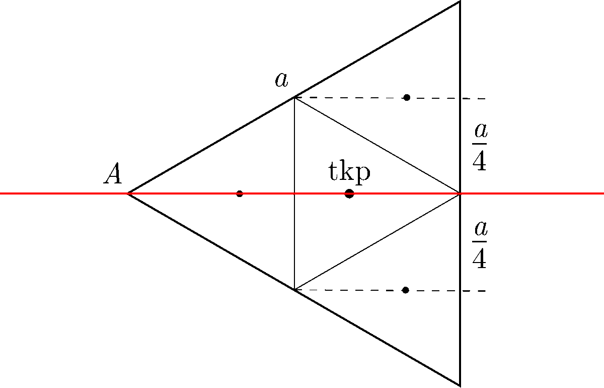 Az egyenletből \(\displaystyle k_1=\tfrac{1}{12}\) adódik. Végül a csúcson átmenő tengelyre vonatkoztatott tehetetlenségi nyomatékot a Steiner-tétel alapján határozzuk meg (felhasználva, hogy a tömegközéppont és a csúcs távolsága \(\displaystyle 2d=\tfrac{\sqrt{3}}{3}a\)):