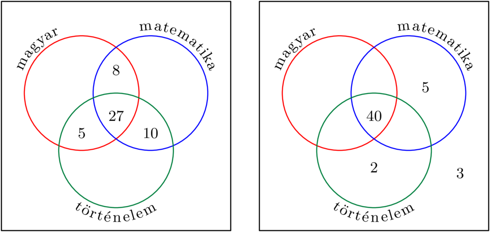 Legfeljebb 40 tanuló kaphatott mindhárom tárgyból ötöst, mert magyarból mindössze 40 jeles született. A további 10 tanuló közül – például – 2 történelemből, 5 matematikából kapott ötöst, a többi (3) a három tantárgy egyikéből sem kapott ötöst (2. halmazábra). (Vagy 2-en történelemből és matematikából is, 3-an csak matematikából, és 5-en egyikből sem; vagy egyvalaki történelemből és matematikából is, egyvalaki csak történelemből, 4-en csak matematikából, és 4-en egyikből sem.