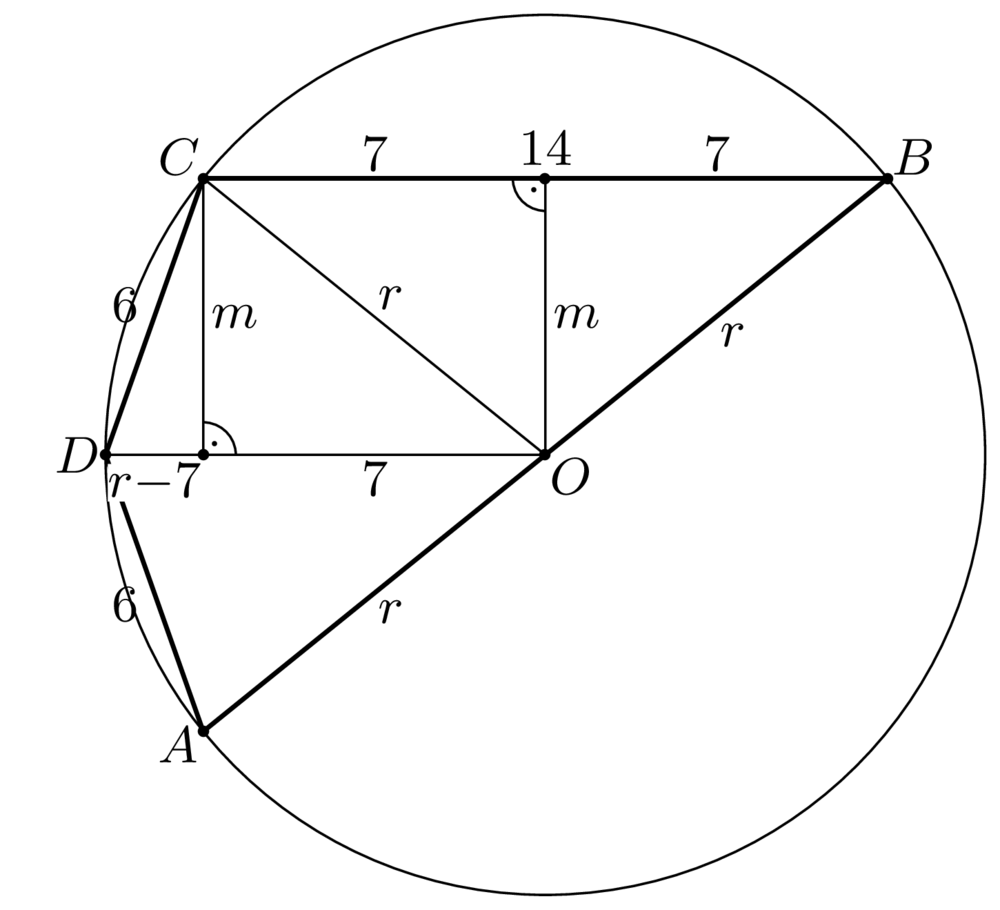 16. Az alábbi ábra szerint az \(\displaystyle ABCD\) húrnégyszög \(\displaystyle AB\) oldala a körülírt körének átmérője, további oldalainak hossza pedig rendre \(\displaystyle BC=14\), \(\displaystyle CD=DA=6\) egység.