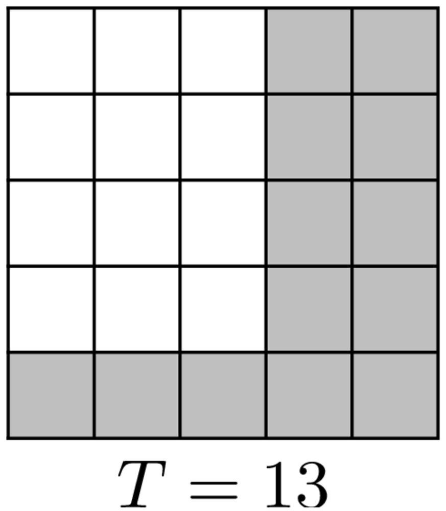 24. Andris megrajzolta az \(\displaystyle 5\times 5\)-ös négyzetrácsban az összes olyan rácsvonalakon haladó útvonalat, amely a bal alsó sarokból a jobb felső sarokba vezet, és 1 egység hosszúságú jobbra vagy felfelé irányuló szakaszokból áll. Minden egyes esetben kiszámította a négyzetrácsnak az útiránytól jobbra eső területét. Az alábbi ábrákon két példa látható. Hány egység az Andris által kiszámolt területek összege?