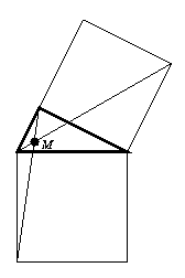 Gy. 3283. Egy derékszögű háromszög egyik befogójára és átfogójára négyzetet rajzoltunk kifelé, és megszerkesztettük az M pontot az 1. ábrának megfelelően. Bizonyítsuk be, hogy M rajta van a háromszög beírt négyzetének kerületén (2. ábra).